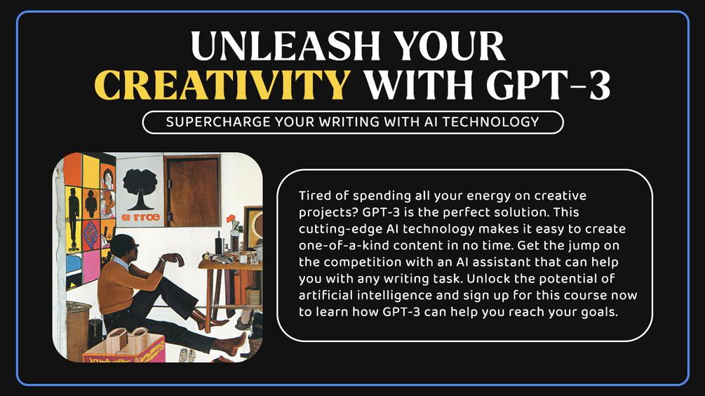 Tired of spending all your energy on creative projects? GPT-3 is the perfect solution. This cutting-edge AI technology makes it easy to create one-of-a-kind content in no time. Get the jump on the competition with an AI assistant that can help you with any writing task. Unlock the potential of artificial intelligence and sign up for this course now to learn how GPT-3 can help you reach your goals.